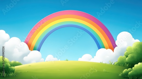 A vibrant cartoon-style rainbow arches over a lush green landscape, set against a bright blue sky filled with fluffy white clouds, evoking feelings of joy and tranquility.