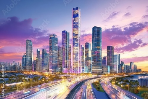 architecture, structure, highway, colourful, light, sky, urban, movement, metropolis, vibrant, evening, city, cloud, city landscape, sunset, skyscraper, modern, pink, city landscape, building, panoramic, dusk, traffic, purple, road, illuminated, twilight, glow, colours
