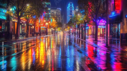 A vibrant cityscape showcasing a modern boulevard at night, with illuminated skyscrapers and neon signs reflecting on wet pavement after a rain shower, adding to the beauty