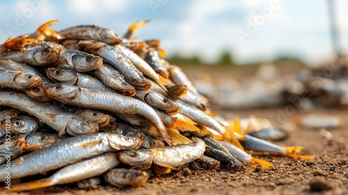 A vibrant close-up of a stacked pile of fresh fish at a marketplace, highlighting the abundance of seafood and the lively atmosphere of a bustling market environment.