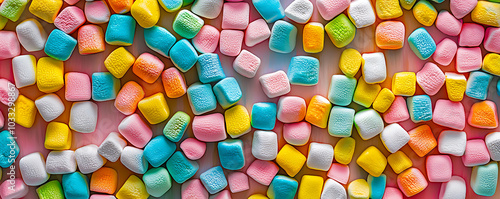 A vibrant close-up view of mini marshmallows in a variety of pastel colors, creating a playful and colorful texture.