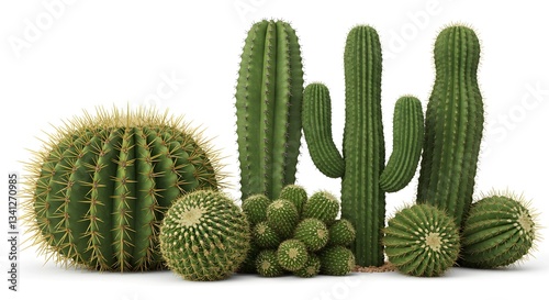 A vibrant cluster of green cacti with long, white spines and golden-orange tops, showcasing nature's intricate desert beauty and resilience. isolated on a white background.