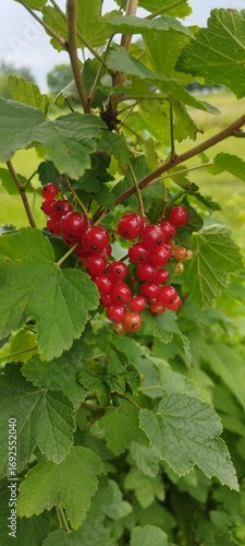 A vibrant cluster of ripe red currants hangs from a green bush. The juicy berries and lush, detailed leaves are highlighted, showcasing a summer harvest in a garden.
