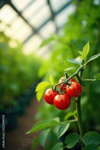 A vibrant cluster of ripe red tomatoes thrives on a lush green vine within a sunlit greenhouse environment