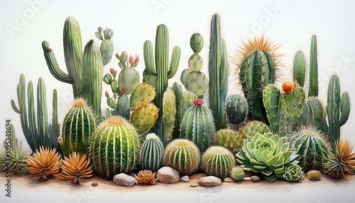 A vibrant collection of cacti and succulents in varying shapes and sizes, showcasing the beauty of desert flora.