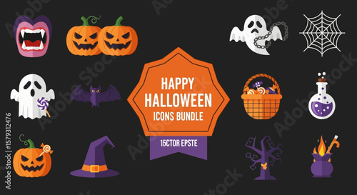 A vibrant collection of flat-design Halloween icons, including pumpkins, ghosts, bats, and witches' hats.