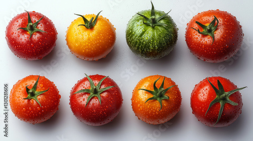 A vibrant collection of ripe and unripe tomatoes in various hues, glistening with fresh water droplets. Captured in natural light, the produce showcases their freshness and appeal