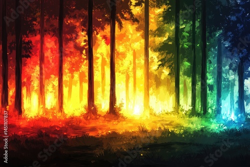 forest, fire, colourful, vibrant, tree, flames, magical, surreal, rainbow, glowing, spectrum, red, orange, yellow, green, blue, indigo, violet, illuminated, fantasy, adventure, nature, light, dark, wood, path, landscape, artistic, digital, painting, imagination, art, burning, beautiful, amazing, intense, high-coloured, spectacular, surrealism, spectacle, visionary, elemental, epic, enchanted, whimsical, dreamlike