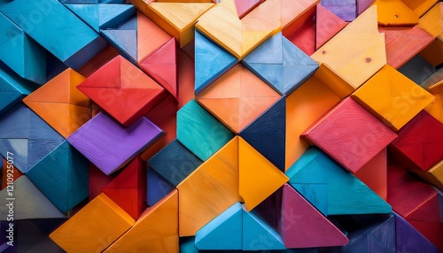 A vibrant composition of interlocking geometric shapes in diverse colors, representing unity and connection. Each shape has unique textures to symbolize individuality within a collective.