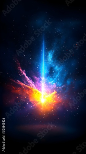 A vibrant, cosmic beam pierces a nebula of swirling orange and blue hues, emanating a bright light at its base against a dark, star-studded backdrop