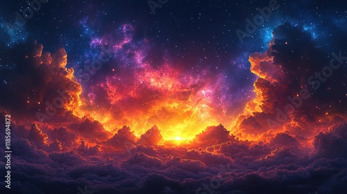 A vibrant cosmic scene depicting a fiery sunset amidst colorful clouds and starry skies.