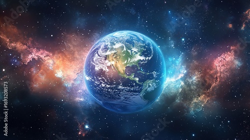 A vibrant depiction of Earth surrounded by a colorful cosmic backdrop, showcasing the beauty of our planet in the universe.
