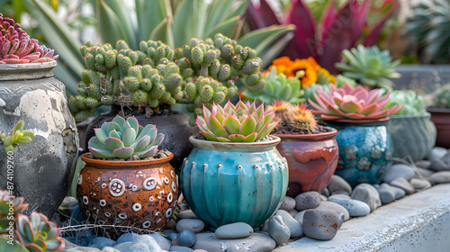 A vibrant desert garden filled with succulents and cacti in bloom, accented by decorative rocks, colorful ceramic pots, and metal art sculptures.