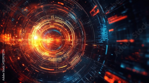 A vibrant, digital abstract image featuring a circular design with glowing elements in orange and blue, evoking a sense of technology and futuristic themes.