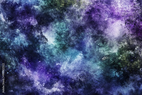 A vibrant digital abstract painting that resembles a cosmic nebula. The background is a dark blue with swirling patterns of purple, green, and white. The painting has a sense of movement and energy.