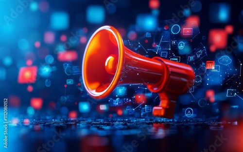 A vibrant digital illustration of a red megaphone surrounded by abstract data symbols, representing communication and information sharing.