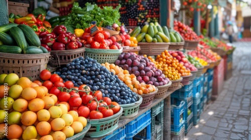 market, stall, produce, fruit, vegetable, fresh, colourful, vibrant, orange, red, green, yellow, purple, blue, tomatoes, citrous, grape, plum, apricot, cucumber, pepper, basket, racked, shop, retail, food, healthy, organic, local, seasonal, variety, abundance, delicious, alimentary, lifestyle, culture, shopping