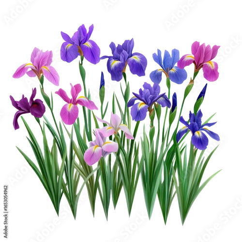 A vibrant display of irises in various shades of purple, pink, and blue, set against a transparent background