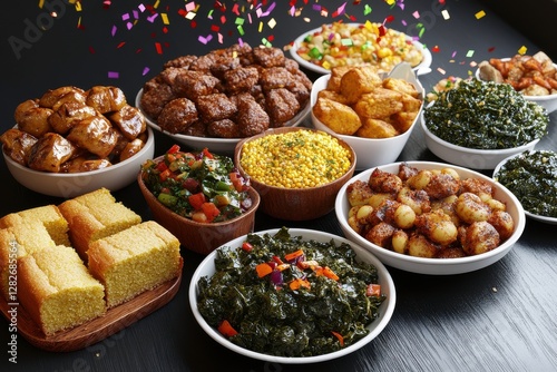 A vibrant display of various delicious dishes, featuring bowls of meatballs, greens, cornbread, and festive confetti, perfect for a celebration.