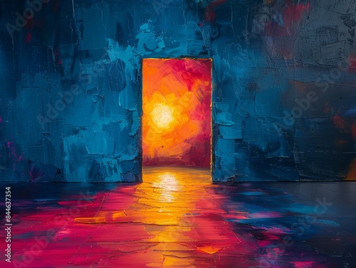 A vibrant doorway on a deep blue canvas, radiating hope and new beginnings with pops of yellow, pink, and purple.