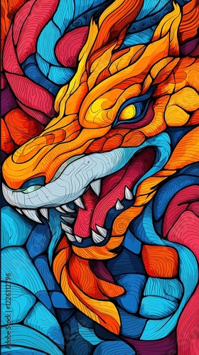 A vibrant dragon illustration featuring bold colors and dynamic lines, showcasing its fierce expression and intricate scales.