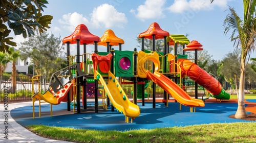 A vibrant, engaging playground with colorful equipment encouraging imaginative play and physical activity.