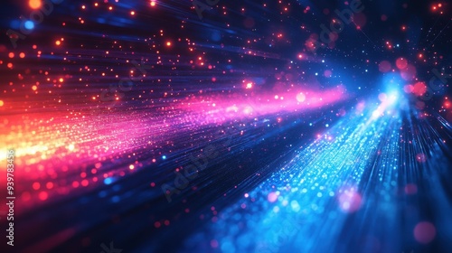 A vibrant explosion of colorful light trails in red, pink, and blue hues, resembling a futuristic burst of fiber optic energy.