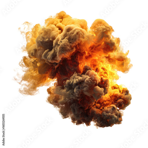 explosion, fire, smoke, flames, cloud, orange, yellow, brown, black, graphic, dynamic, intense, burst, power, energy, chaos, abstract, dramatic, violent, high-coloured, hot, fiery, smoky, dense, billowing, thick, rapid, spreading, powerful, detail, texture, design, digital, image, artistic, visual, impact, force, destruction, event, motion, large, center, isolated, composition, dark, light