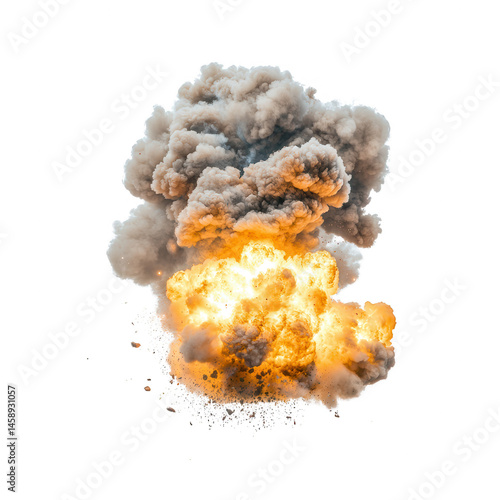 A vibrant explosion with thick smoke and fire against a white isolated background, symbolizing chaos and destruction.