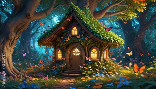 A vibrant fairy home with a garden filled with colorful butterflies, nestled under a canopy of shimmering leaves in an enchanted forest, Generative AI
