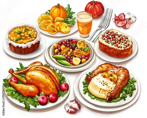 A vibrant feast featuring a roasted turkey, pumpkin pie, and seasonal fruits, perfect for a festive gathering.