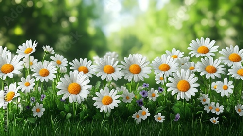A vibrant field of daisies in full bloom under soft sunlight, surrounded by lush greenery