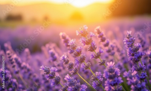 A vibrant field of lavender blooms at sunset, creating a tranquil and colorful atmosphere.