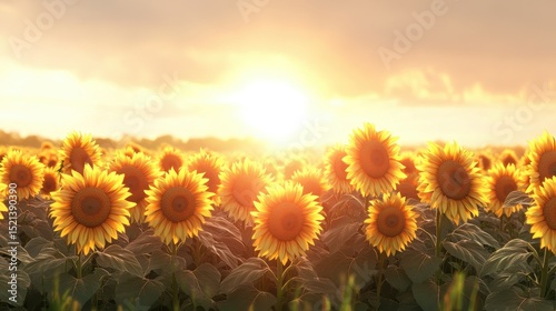 A vibrant field of sunflowers basking in the warm glow of the setting sun.