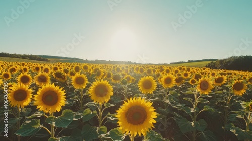 A vibrant field of sunflowers stretches towards the horizon, illuminated by the warm glow of the setting sun. The serene atmosphere embodies the beauty of a perfect summer evening.