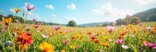 A vibrant field of wildflowers in full bloom under a bright spring sky, perfect for a relaxing picnic or leisurely stroll , bright, light