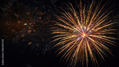 A vibrant firework display explodes in a burst of colorful light against a dark night sky.