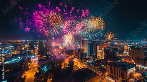 A vibrant fireworks display lighting up the night sky over a bustling city skyline, with colorful bursts reflecting off the buildings