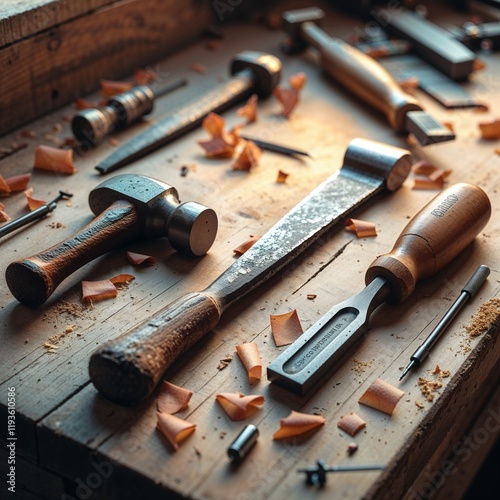 A vibrant flat lay of old hand tools: a hammer, chisel, and wooden-handled screwdrivers on a workbench