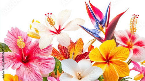 A vibrant floral arrangement of tropical flowers like hibiscus, plumeria, and birds of paradise, set against a clean white background to highlight their bright colors