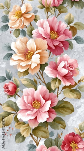 A vibrant floral design featuring large pink and peach flowers with lush green leaves, perfect for decorative purposes.