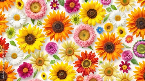 A vibrant floral pattern featuring a mix of bright flowers such as sunflowers and daisies against a bold and modern white background, abstract, colorful, nature, playful, spring