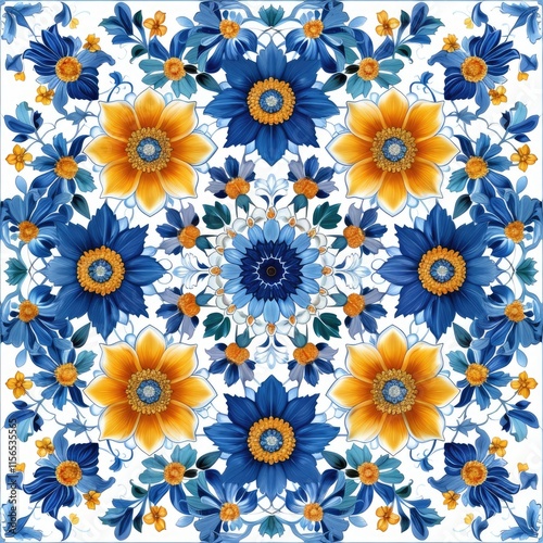 A vibrant floral pattern featuring blue and orange flowers on a white background.