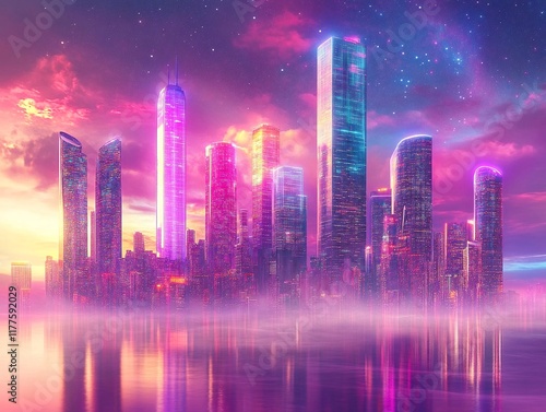 futuristic, city, skyline, colourful, light, reflections, neon, architecture, urban, sunset, modern, skyscraper, technology, landscape, night, bright, fantasy, digital, metropolis, horizon, water, fog, illumination, atmospheric, city landscape, tower block, glowing, shimmering, panoramic, surreal, dreamlike, artistic, imaginative, beautiful, stunning, captivating, enchanting, aethereal, aglow, twilight, dusk, radiant