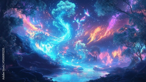 water, tree, forest, landscape, glowing, fantasy, colourful, bright, blue, purple, orange, sky, night, star, stream, river, aethereal, aglow, mystical, scene, natural, environment, artistic, light, tranquil, serene, magical, cosmic, flow, vortex, energy, animated, dreamlike, illuminated, fantastic, imaginative, picturesque, atmosphere, vibrant, swirling, dynamic, background, design, composition, beautiful