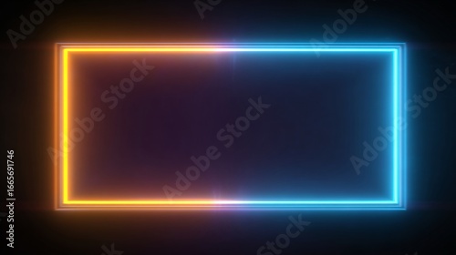 A vibrant, glowing neon rectangle frame, bisected by a gradient of warm and cool tones, creates a dynamic visual effect.