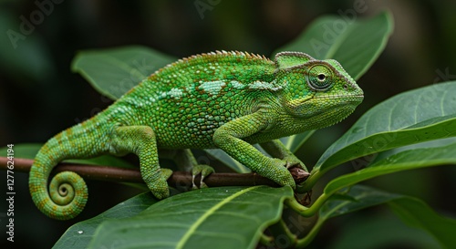 A vibrant green chameleon clings to a branch amidst lush leaves, showcasing its detailed scales and curled tail in a tropical jungle setting.