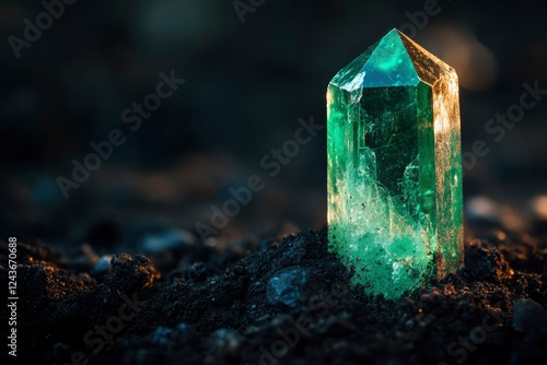 crystal, emerald, green, gemstone, earth, ground, dirtied, dark, nature, mineral, rock, precious, gem, light, shine, sunlight, sparkle, beauty, colours, texture, surface, detail, clarity, transparency, facet, point, peak, sharp, rough, contrast, shadow, depth, background, vibrant, intense, magical, mystical, energy, power, rare, valuable, elegant, unique