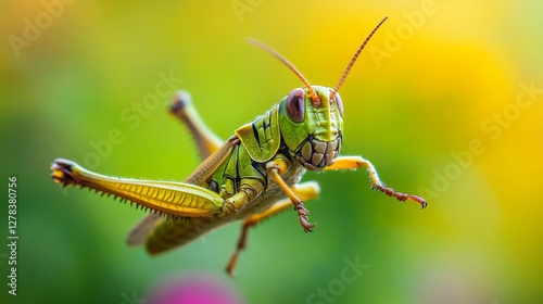 A vibrant green grasshopper leaps gracefully through a colorful background. This image captures the beauty of nature and its fascinating creatures. Generative AI