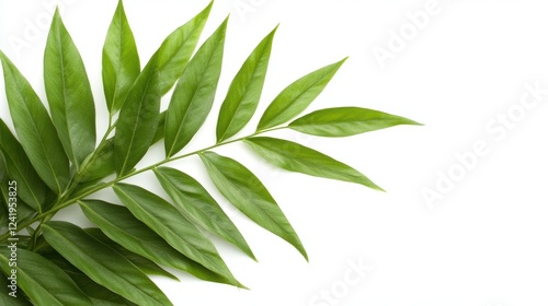 A vibrant green leaf branch with glossy leaves arranged artistically on a clean white background, ideal for use in nature-themed projects, environmental campaigns, or botanical illustrations,